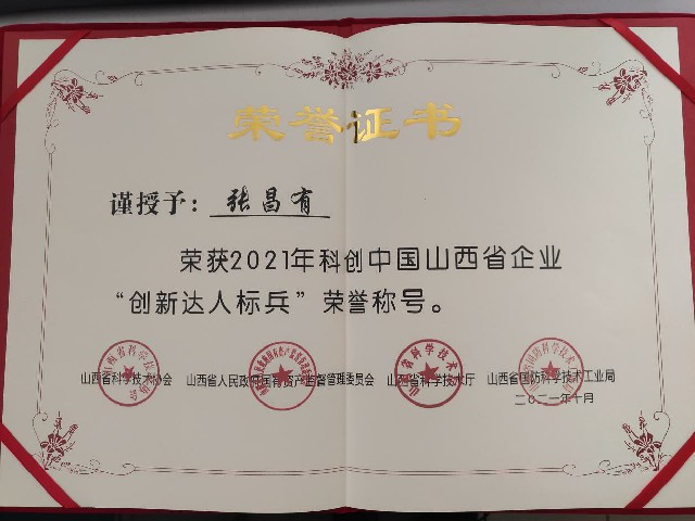 In the 2021 China Shanxi Province enterprises "innovation talent" activities, the company's general manager Zhang Changyou won the 2021 China Shanxi Province enterprises "innovation talent model" honorary title, and was hired as 2021 China Shanxi Province enterprises "innovation talent" publicity group representative, By the association for science and technology in Shanxi Province, Shanxi Province people's government state-owned assets supervision and administration commission, science and technology department of Shanxi Province, the national defense science and technology industry in Shanxi Province awarded 2021 kechuang enterprise in Shanxi Province of China's got talent "innovation model" honorary certificate and 2021 kechuang enterprise in Shanxi Province of China's got talent "innovation" XuanJiangTuan representative.